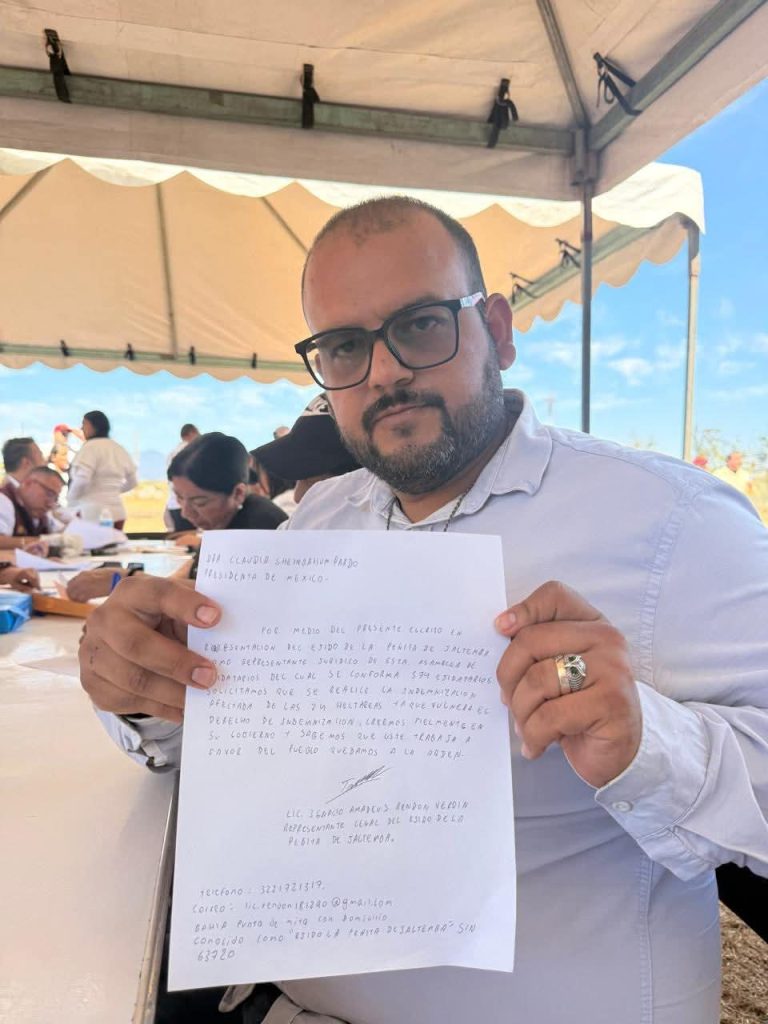 15 de marzo de 2026.- En la visita que realizó la Presidenta de México a Compostela, desde la unidad deportiva de la localidad, resaltó un grupo de ejidatarios que desean justicia. Ignacio Rendón, líder social, mencionó que, por amor a nuestra tierra y por respeto a nuestros ejidatarios, hoy realizó una solicitud formal respecto a las 24 hectáreas que aún no han sido indemnizadas por la expropiación de la autopista Jala-Vallarta. “Se trata de un derecho de nuestros ejidatarios que durante años han esperado justicia», compartió.