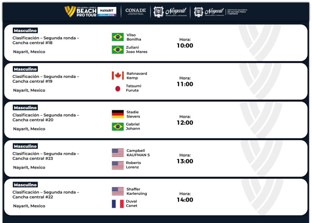 Para este miércoles 25 de marzo, la actividad dará inicio a partir de las 10:00 horas con una cartelera que incluye los encuentros entre Vilso/Bonilha (BRA) frente a Zuliani/Joao Mares (BRA); posteriormente Rahnavard/Kemp (CAN) se medirán ante Tatsumi/Furuta (JPN) a las 11:00 horas.