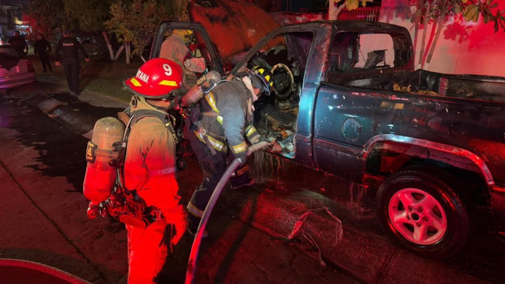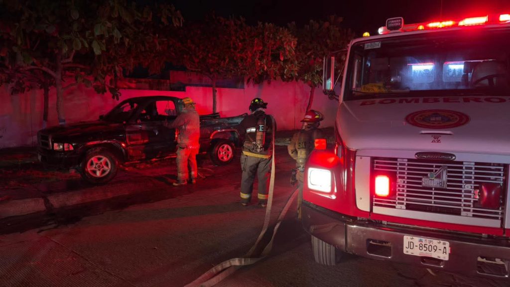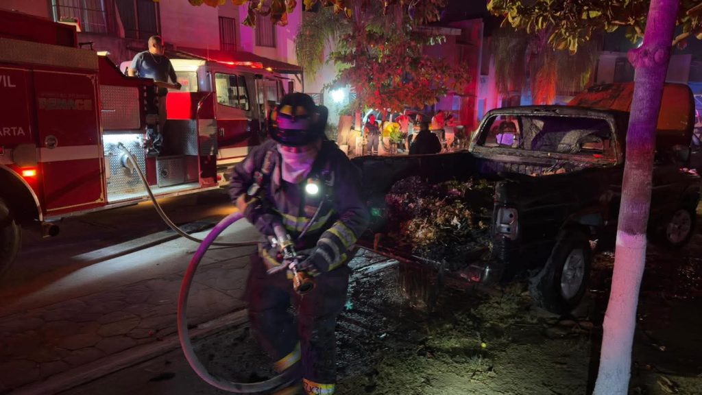 Protección Civil y Bomberos Puerto Vallarta atienden reporte de incendio en un vehículo tipo pickup en el fraccionamiento Balcones Vallarta, el cual afectó principalmente la cabina de la unidad, propagándose posteriormente a desechos inorgánicos localizados en la parte trasera de la caja.
